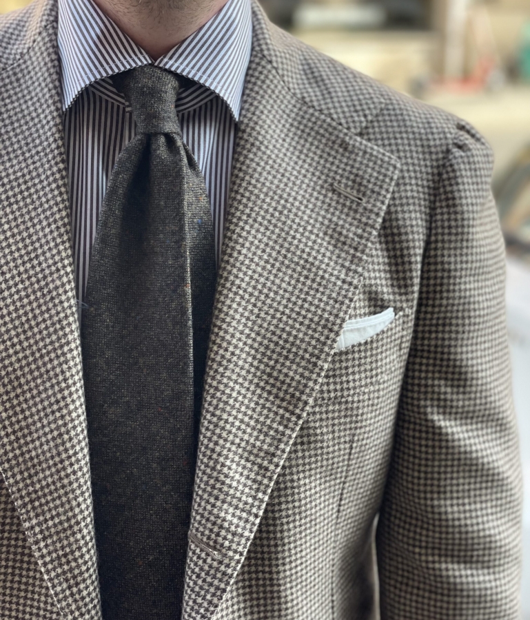 Made with a 100% cashmere fabric by Joshua Ellis in UK. Construction is our classic half lined with a soft shoulder.