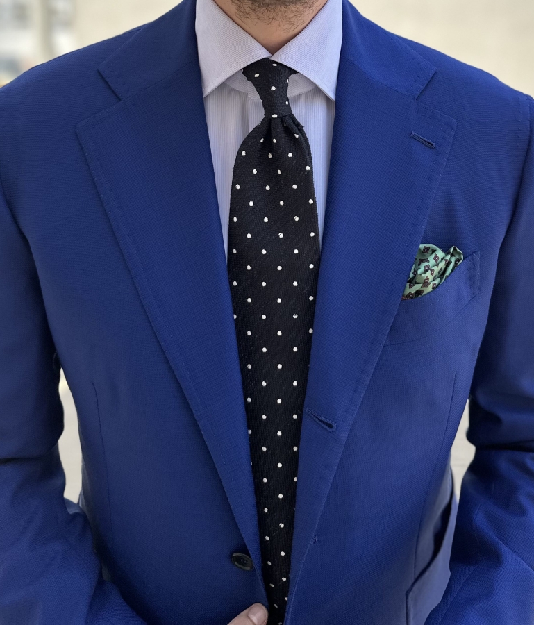 This characteristic silk fabric is namned after the Shangdong province in China, which in the English speaking world was previously known as Shantung. The heavily textured weave is a 4 seasonal fabric. Ideal for the warm days of summer, as it gives off a feeling of downplayed elegance, just like a well worn linen suit. But, the most popular and well sold tie for Autumn/Winter were you can combine it with your luxury cashmere sport blazer or why not you flannel suit.